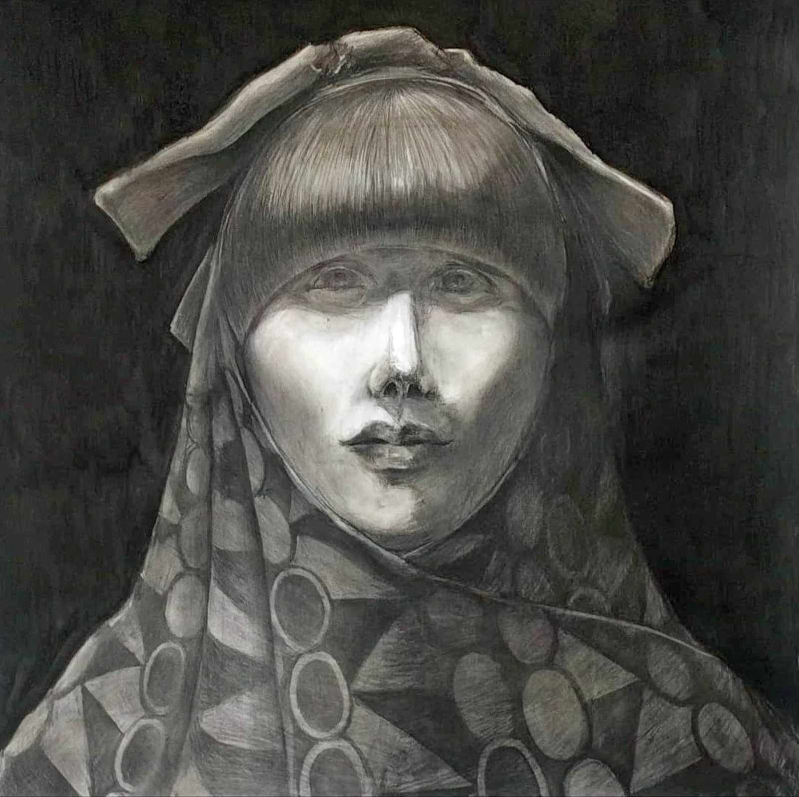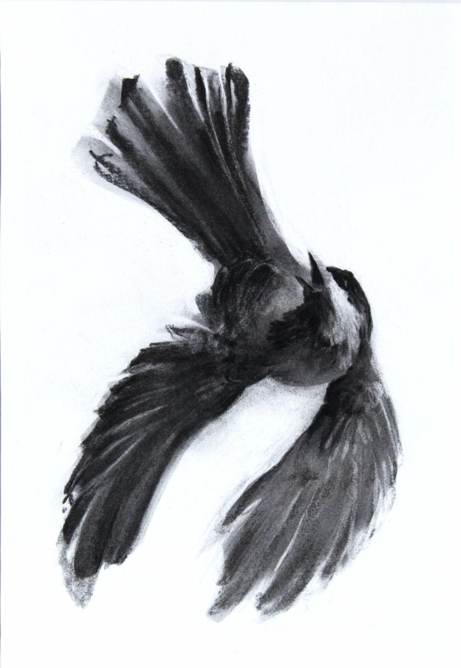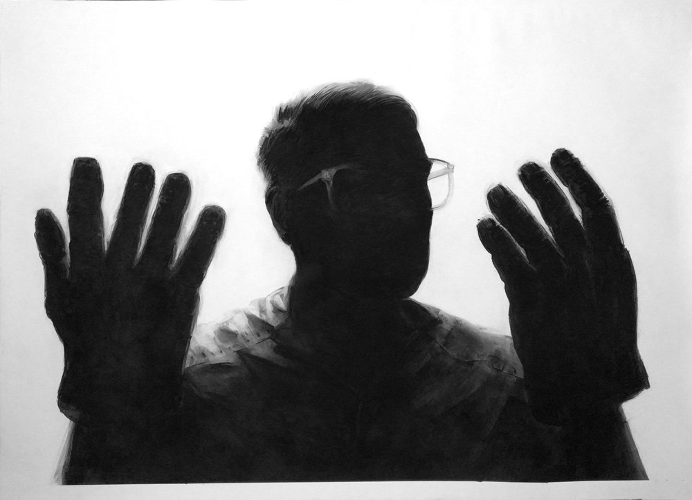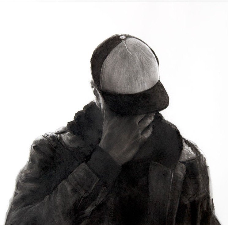 In zijn eigen werk – mysterieuze zelfportretten, mensfiguren en vogelreeksen – bouwt Patrick het beeld laag voor laag op met houtskool. Door te vegen, te wissen, opnieuw te tekenen en tussendoor te fixeren, ontstaat een zeldzaam rijk, velours zwart waarin het licht lijkt te verdwijnen.